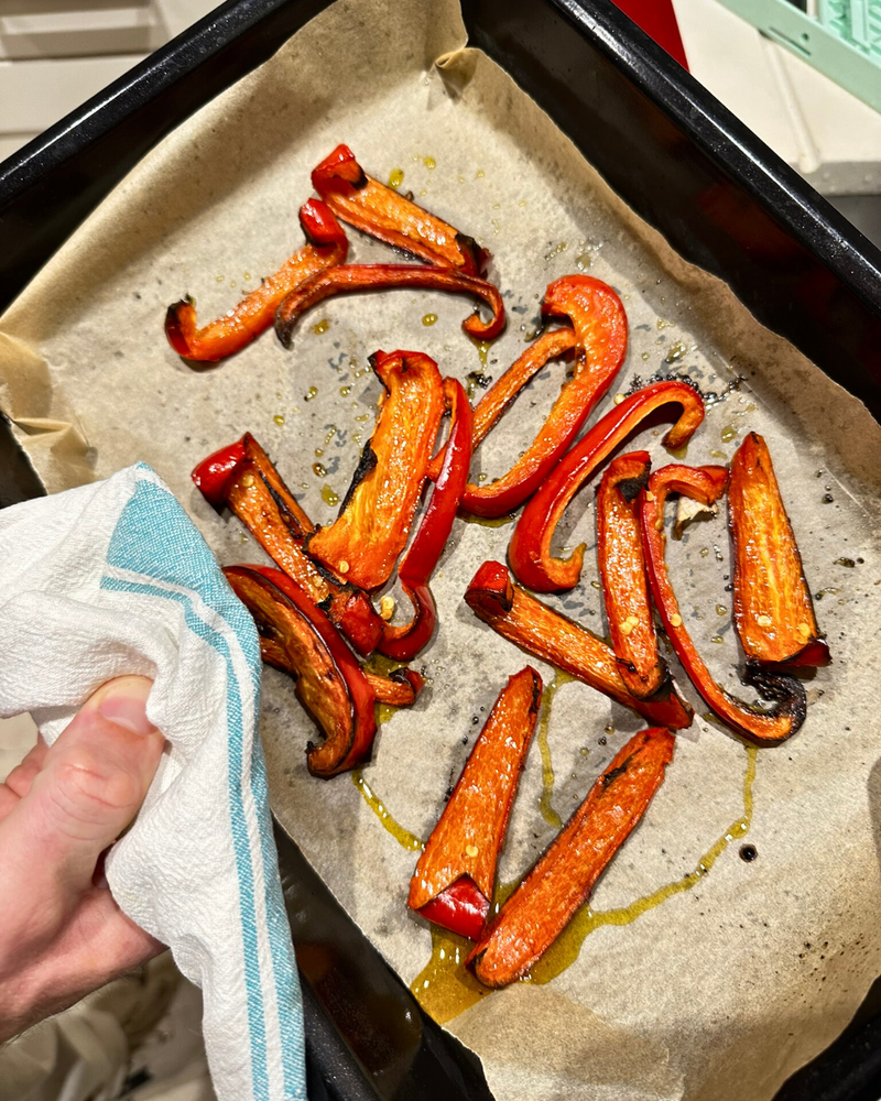 Toss the pepper with olive oil and salt. Roast in the oven at 200°C (400°F) for 20-30 minutes, or until the edges are charred.