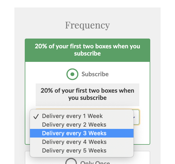 Here's the important bit - if you're subscribing, make sure to hit the SUBSCRIBE button in the frequency box. You'll also be able to select how often you'd like deliveries in this box: choose between every 1, 2, 3, 4 or 5 weeks. You can always come back and change the frequency later if you change your mind.